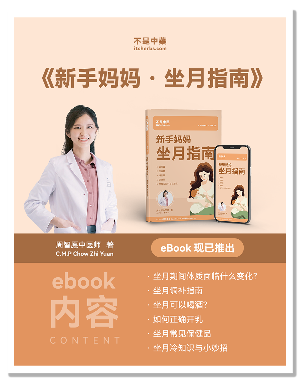 由周智愿中医师 亲自撰写,带你全面了解坐月子,从产后身体变化到饮食调理、哺乳技巧,还有精选坐月产品推荐,为你提供全方位的指导。